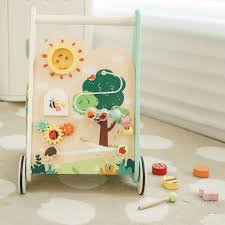 Le chariot de marche forêt Classic World combine aide à la marche et centre d’activités dans un jouet en bois stable. Les roues souples assurent une poussée sécurisée, tandis que les nombreux éléments interactifs – curseur, perles, engrenages et boîte à formes – entraînent la motricité fine ainsi que la reconnaissance des formes et des sons. L’association du mouvement et du jeu renforce l’équilibre et la confiance en soi de manière ludique.